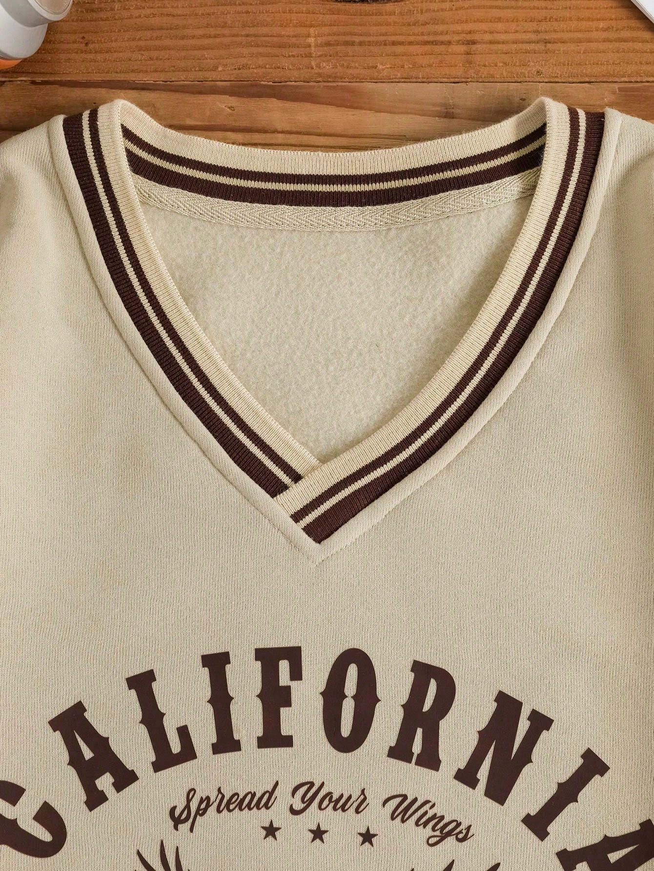 Step into effortless style this season with the Graphic Striped Trim V-Neck Sweatshirt, a must-have pullover that blends classic collegiate charm with modern casual appeal. Crafted from soft knitted fabric with a slight stretch, this sweatshirt offers unmatched comfort and a relaxed fit that flatters every body type.