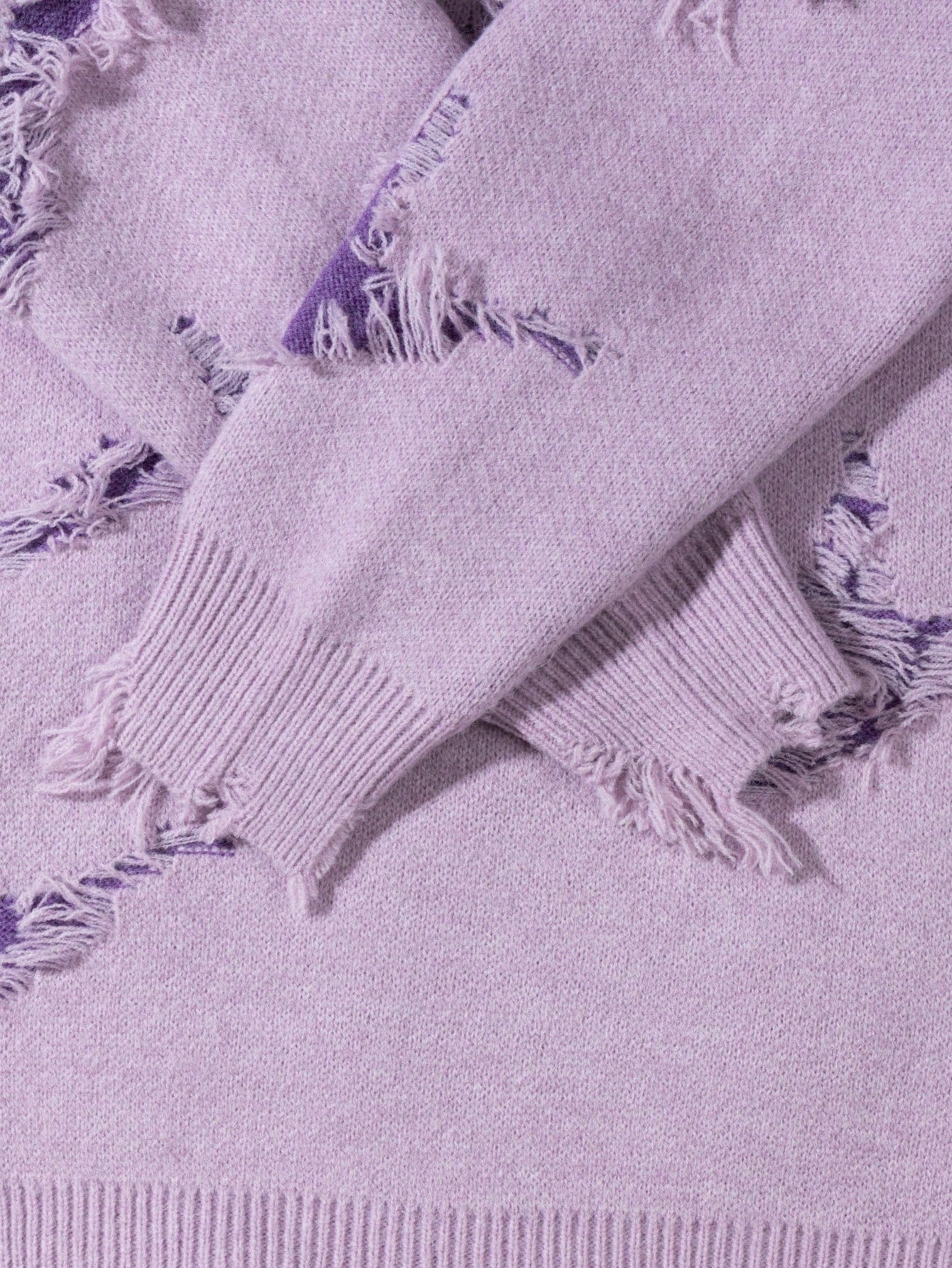 Whether you’re heading to a late-night hangout or a casual coffee run, this distressed embroidered sweater brings an unapologetic attitude to your outfit. The Gothic-inspired embroidery contrasts beautifully with the soft purple tone, adding a punk-inspired elegance that balances ruggedness with creativity. Pair it with black ripped jeans, chunky sneakers, or combat boots for the ultimate urban edge look.