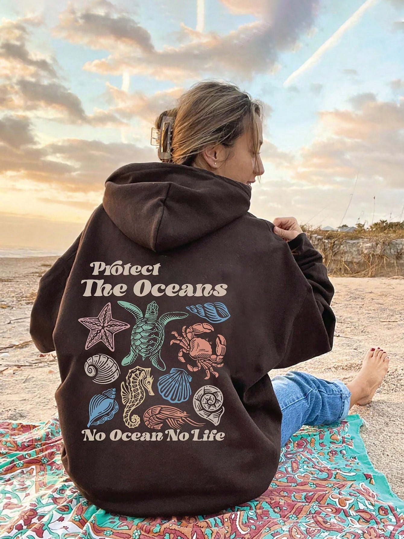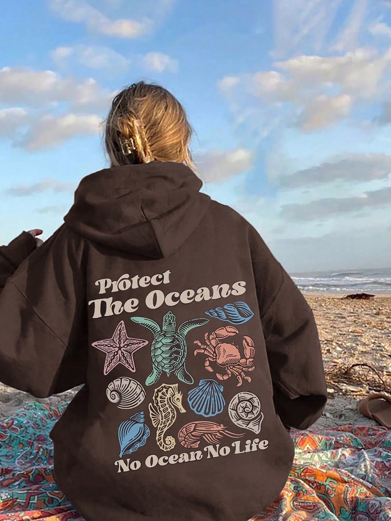 Featuring the bold phrase āProtect The Oceans ā No Ocean No Lifeā, this hoodie stands as a fashionable reminder to care for our planet. The artistic geometric and plant-inspired graphics, including marine creatures like turtles, starfish, crabs, and shells, add an earthy, coastal charm. Perfect for teachers, students, and nature lovers, this print combines environmental awareness with laid-back everyday wear.