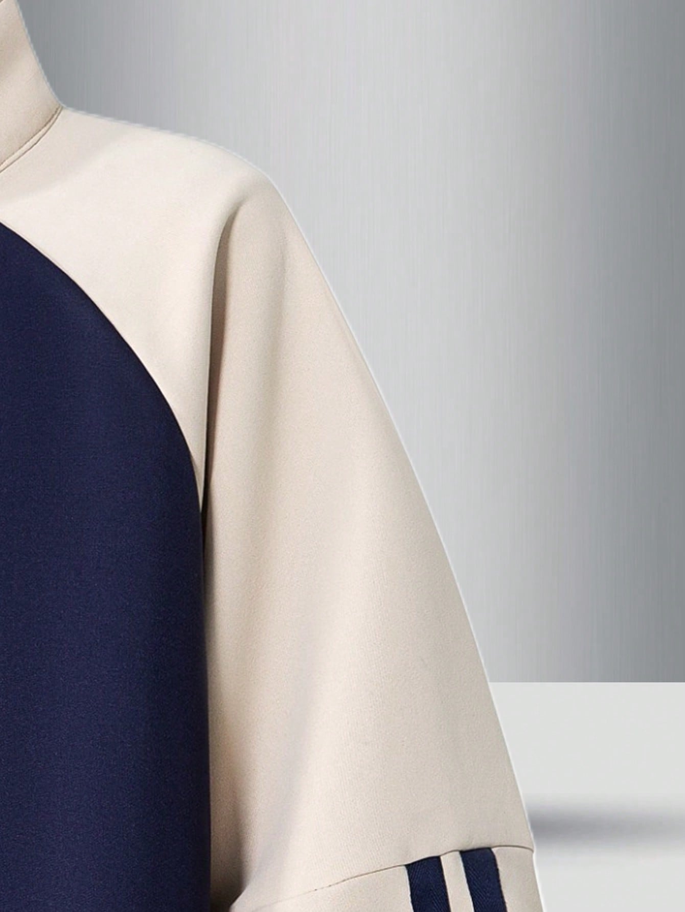 The funnel neck and half-zip placket introduce a refined yet sporty appeal, allowing you to adjust your look — zip up for a cleaner silhouette or unzip for a laid-back touch. The navy blue body contrasted with beige sleeves and bold twin stripes down the arms delivers a timeless preppy aesthetic with a modern twist.
