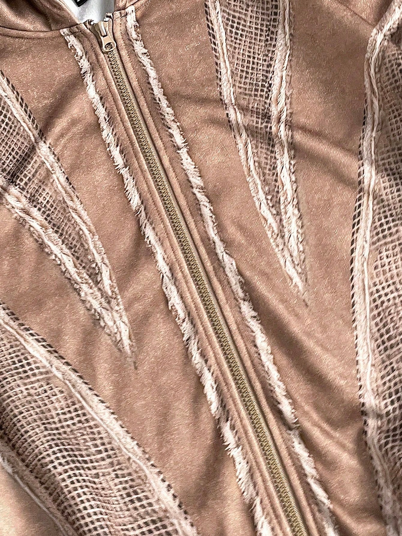 Men's Brown Distressed Cropped Loose Zip-Up Hoodie
