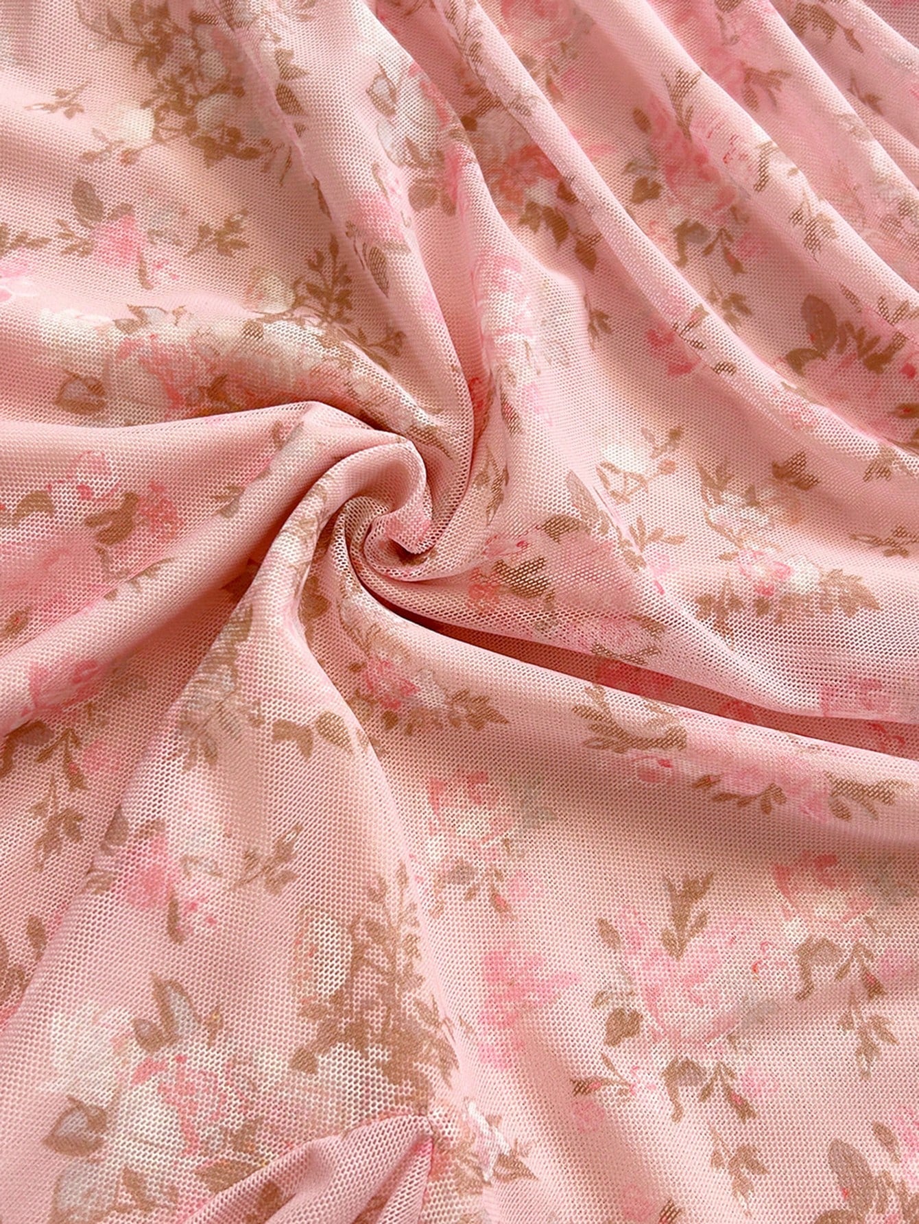 Pink Floral Mesh Ruched Mini Dress Sexy Backless Cami
