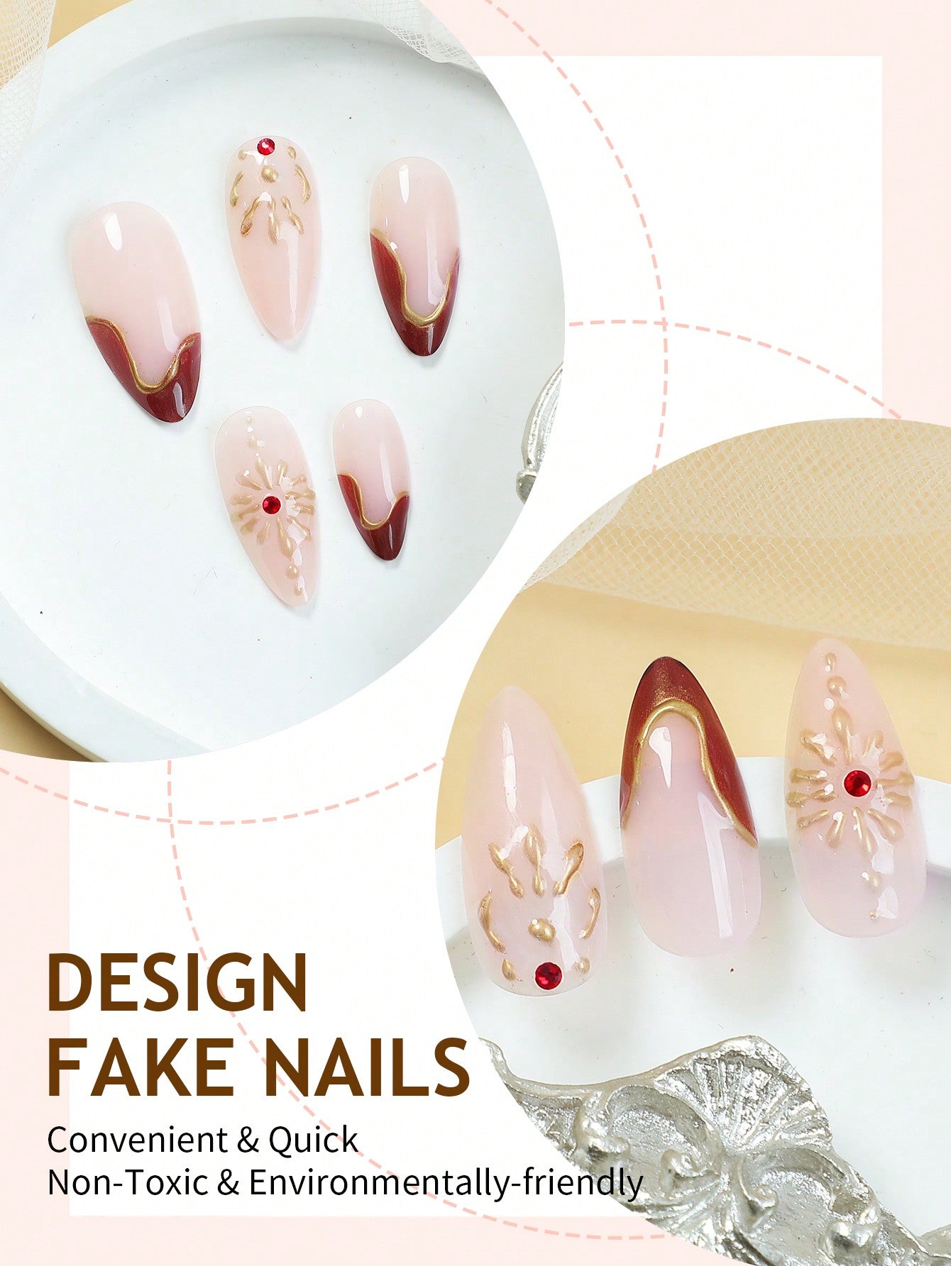 Red Ombre Almond French Nails with 3D Gold Lines