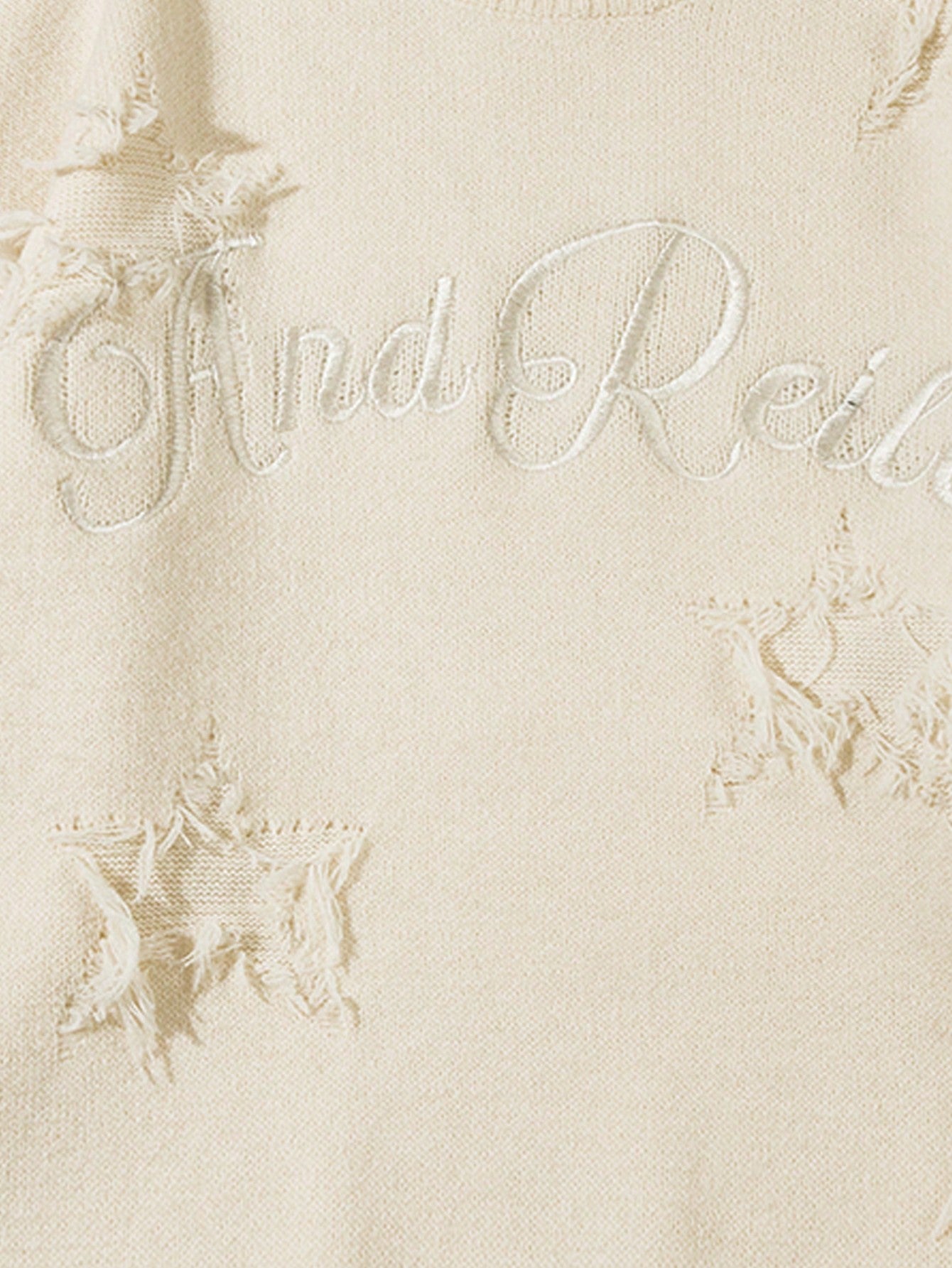This sweater captures attention with its intricate embroidery, ripped accents, and tassel details that exude a punk-inspired aesthetic. The geometric star patterns and bold embroidered lettering infuse character into the soft apricot knit, giving it a standout look that’s both refined and rebellious. Crafted with high-quality knitwear, the composition features 42% Acrylic, 30% Polyester, and 28% Polyamide, offering a soft texture and slight stretch for all-day comfort.