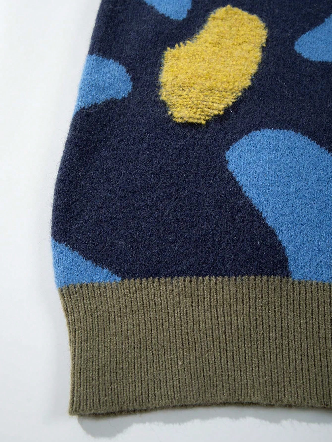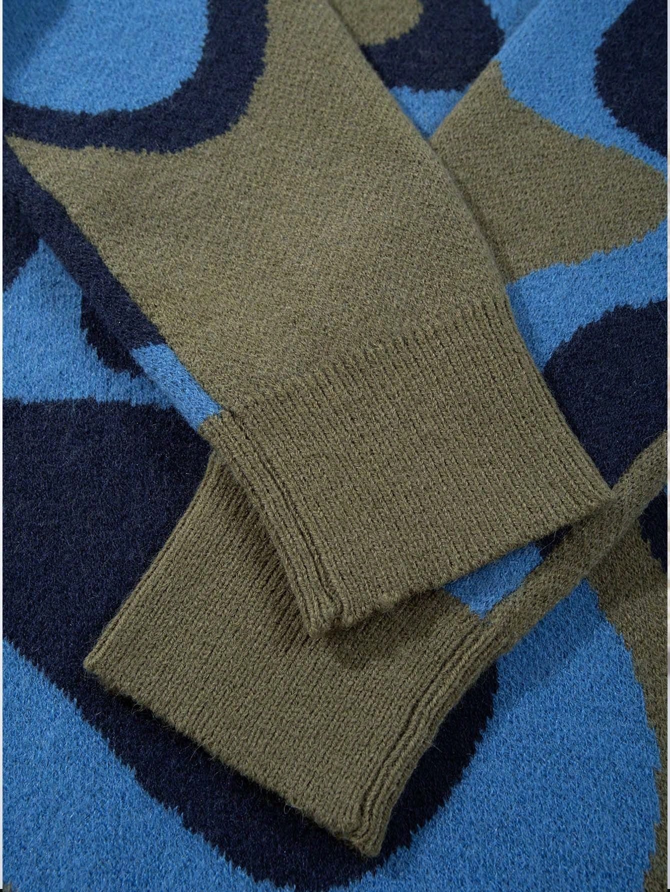 Designed with a round neckline and drop-shoulder silhouette, this pullover embodies relaxed sophistication. The rib-knit detailing along the cuffs, collar, and hem enhances structure while maintaining comfort and shape retention. Its colorblock floral design features bold retro-inspired daisy motifs in contrasting shades of green, blue, and yellow, making it an instant statement piece for any outfit.