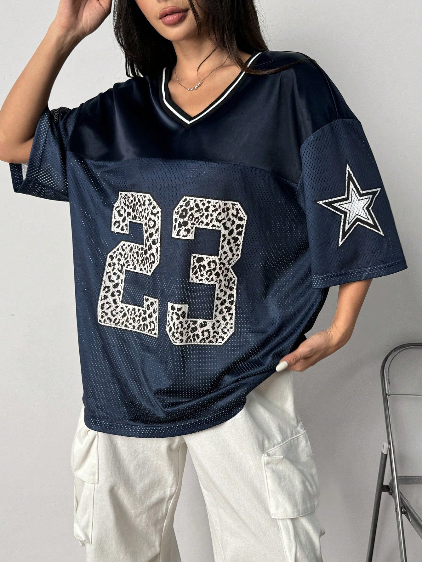 Women's Navy Blue Loose Fit Semi-Sheer V-Neck Jersey