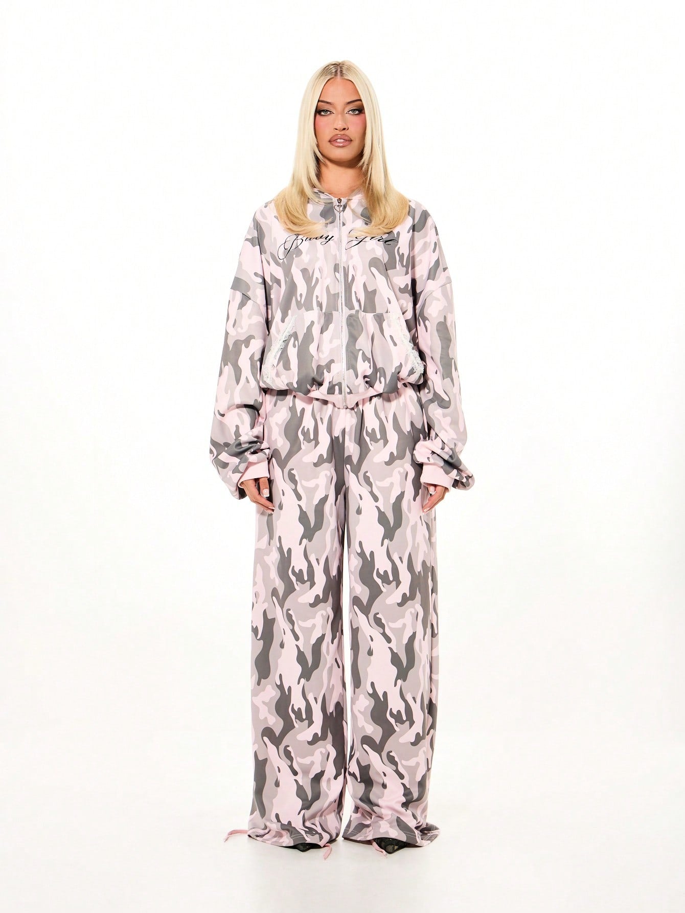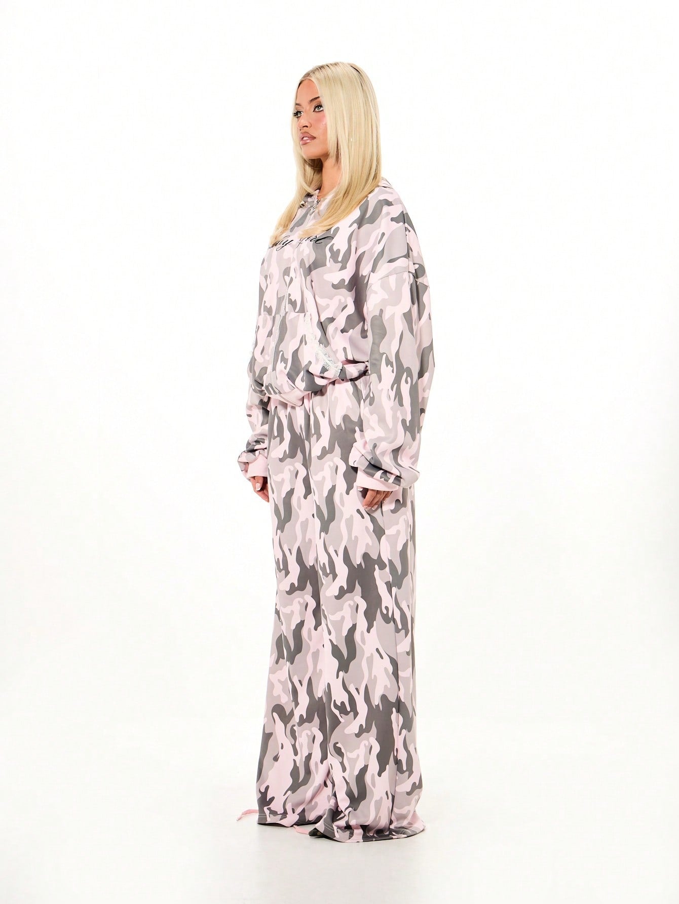 Women's Pink Camo Lace Trim Oversized Full Zip Hoodie